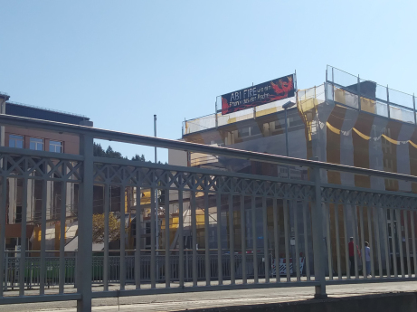 Motto-Transparent der Abiturientia 2019 über den "Ruinen" des Gebäudes (Brand 11/2018).